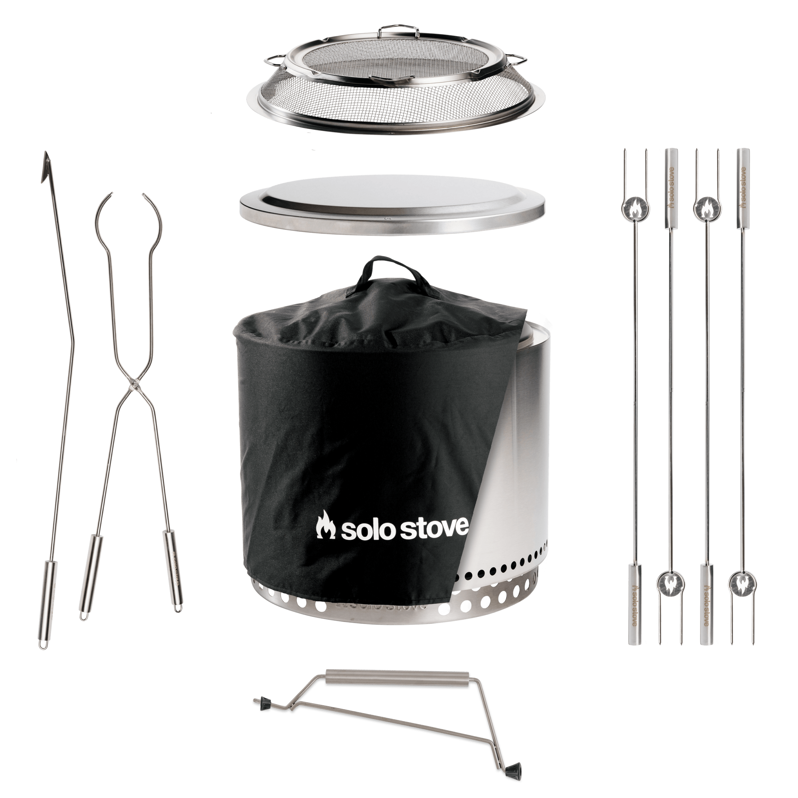 Maksimaliai pasimėgaukite atvira liepsna su Solo Stove priedais. Mėgaukitės papildomu saugumu naudojant skydą ir stovą, šilta naktimi prie ugnies, kurią sustiprina karščio deflektorius, arba pagamintu šeimos maistu ant ketaus grotelių. Ir, žinoma, negalite pamiršti daugiau – lazdelės yra geriausias pasirinkimas puikiai paskrudintiems zefyrams ir užkandžiams.